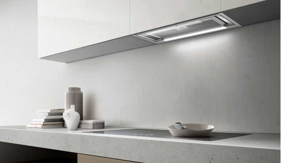 - Встраивание в шкаф. Самый распространенный и простой тип установки. Вытяжка скрыта от глаз, кроме панели фильтров и ламп подсветки, а сам шкаф можно использовать для хранения. Часто подобные модели оснащаются выдвижным козырьком, который увеличивает площадь всасывания.