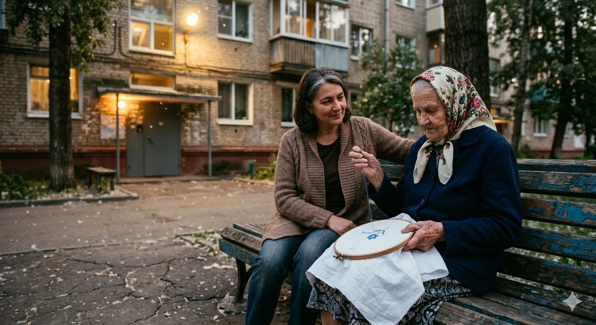 На правом краю сидела Алевтина Петровна. Маленькая, сухая, с прямой спиной, которая не касалась спинки. На коленях белел платок с начатой вышивкой, и игла двигалась ровно, без остановок, будто старуха считала стежки вместо секунд.