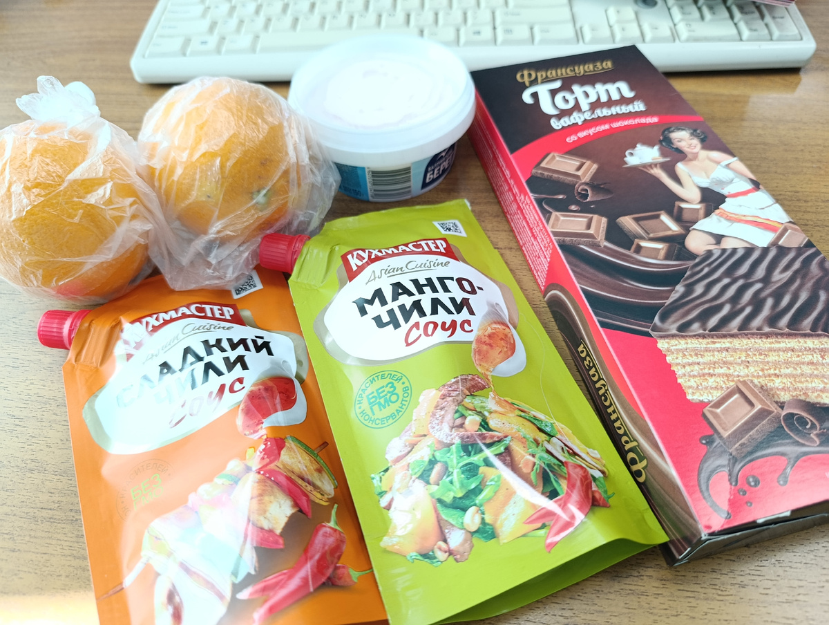 Это пара покупок в "Верном", доставка из " Дикси", а ещё 2 бутылки минералки, печенье на работу к чаю, кефир и хлеб