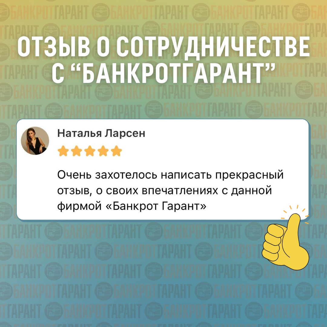Лучше всего о тонкостях прохождения процедуры банкротства говорят отзывы наших клиентов. Делимся историей Натальи — она проходит процедуру банкротства прямо сейчас: 🙎♀️: «Не ожидала, что это будет так быстро: всего одно заседание и меня уже признали банкротом! Осталось совсем чуть-чуть и я смогу свободно вздохнуть от долговых обязательств и начать жить с чистого листа. Хочу выразить восхищение своему юристу и Арбитражному управляющему. Прекрасная и, самое главное, оперативная работа! Все четко и по плану, максимально обо всем оповещают, ничего не нарушают, быстро отвечают на вопросы. Поверьте, мне есть с чем сравнить — мой муж банкротится у другой фирмы. Там процесс тянется уже 3 года и все нет толку… «БанкротГарант» — очень надежная и добросовестная фирма. Обязательно буду рекомендовать своим знакомым. Еще раз спасибо за вашу работу!» Если вы только задумываетесь о процедуре или не понимаете, с чего начать — запишитесь на бесплатную консультацию: https://vk.me/bankrotgarant📲
