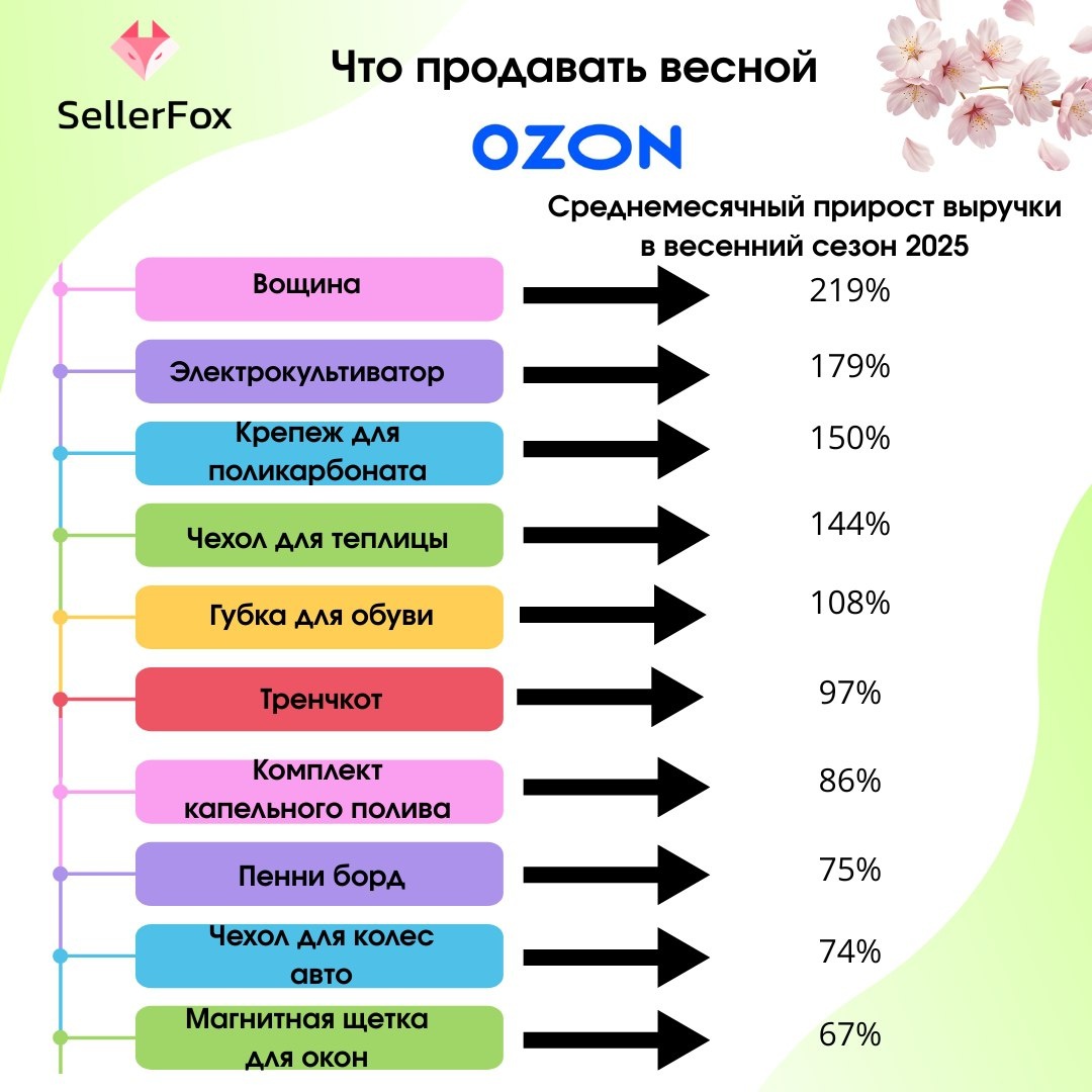 Собрали для вас перспективные ниши сезонных товаров, которые активно покупали на крупных маркетплейсах прошлой весной. Основываясь на этих данных, вы еще успеете собрать урожай на маркетплейсах весной 2026 года. ⬜️ Из необычных находок на Ozon - вощина из категории "Товары для животных". Это искусственная основа для постройки пчелиных сот. Среднемесячный прирост выручки продавцов вощины составил 219%. В топ-10 востребованных весенних товаров также вошли магнитные щетки для окон. Монопольность ниши на Ozon всего 17%, а значит место для новеньких селлеров еще есть. Среднемесячный прирост выручки достиг 67%. ⬜️ На Wildberries семимильными шагами по приросту выручки идут не только дачные товары, но и самокаты, детские качели, беговелы. В сезон генеральной уборки высокий среднемесячный прирост показывают также роботы-стеклоочистители - сразу 73%. В категории "Одежда" выстрелили ветровки, при этом монопольность ниши всего 2%, конкуренция не так высока. Не тратьте весенние дни на исследова
