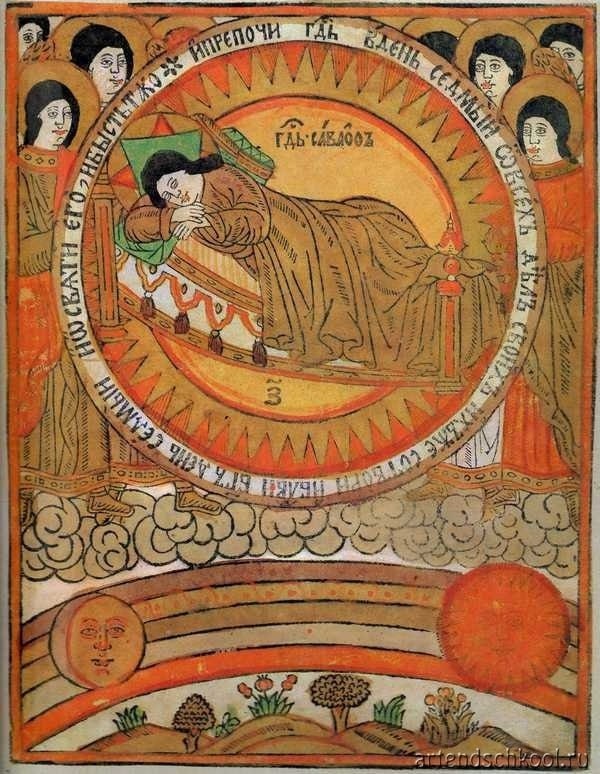 ! "И почи Бог в день седмый". Иконография аллегорической композиции окончания творения мира возникла при митрополите Макарии и восходит к клейму «Четырехчастной» иконы из Благовещенского собора Московского Кремля середины XVI века. Сюжет был запрещен Указом Синода 1722 года.