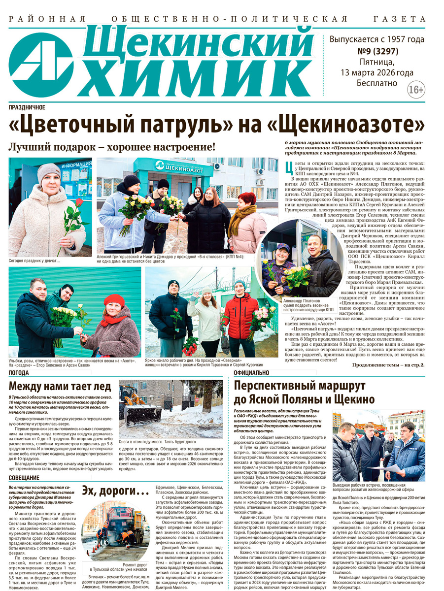 В свежем выпуске газеты - самая актуальная информация о жизни «Щекиноазота» и Щекинского района. ✅ Читайте в этом номере "ЩХ": - «Цветочный патруль» на «Щекиноазоте» - Между нами тает лед: сезон паводка - Поздравления от химиков – педагогам - Итоги Женского дня - Сварка красива, как бенгальский огонь - В ногу со временем. Кластер смол - Начало года: тульская экономика «не спит» - Дай ухо, Джим! Проверим чип! - Команда «Азота» – в борьбе за Кубок Щекинской футбольной лиги - «Ландыши»: цветы надежды - Как Леонид Ильич не попробовал тульский хлеб - Заживем по-новому: законы меняют реальность - Актуальные вакансии предприятия 📍 Газета распространяется бесплатно, получайте в точках выкладки (адреса – в комментариях)! Есть новости? Хотите рассказать о достижениях или проблеме? 📞 Редакция – на связи: +7(48751) 9-28-98, konik@azot.net.