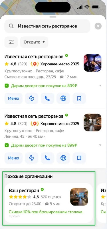 В Яндекс Картах уже несколько месяцев работает карусель «Похожие организации». Когда пользователь ищет конкретную компанию по названию, в выдаче может появиться блок с другими организациями той же категории рядом. То есть человек ищет конкурента, а в карточках ему показывают вас. По сути, это инструмент перехвата брендового трафика. Чем полезно бизнесу Раньше продвигаться в Картах можно было только по рубричным запросам («стоматология», «салон красоты» и т.д.). Теперь можно получать показы по запросам с брендами конкурентов. Это дополнительный охват аудитории, которая уже находится в активной стадии выбора. Почему это работает: когда люди вводят название конкретной компании, они часто ищут не сам бренд, а решение своей задачи. Например, вводят название грузинского ресторана, но на самом деле выбирают, где поесть грузинскую кухню. Или ищут знакомое ателье, но просто хотят быстро подшить одежду. Что обещает Яндекс По данным эксперимента, каждый шестой пользователь после перехода