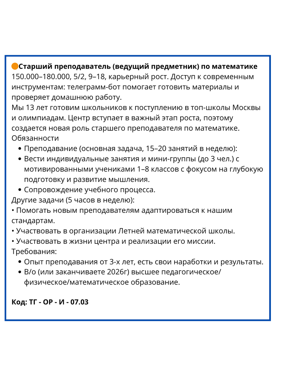 ИИ говорит, что Фидель Кастро родился в пятницу 13-го ))), не знаю, будете ли вы проверять, но мы свои вакансии проверили. Они собраны вручную от знакомых рекрутеров, сегодня - много нестандартного. Приятного изучения 🔎 🟠Финансовый директор группы компаний В торгово-производственную компанию Код: АККС - ТСФ - 06.03 🟠Менеджер по снабжению (закупка оборудования и ТМЦ) Строительные материалы и металлы 📍Минеральные Воды, 5/2, ТК РФ, соцпакет (ДМС, больничные, мобильная связь), доход до 90 тыс. руб. Требования: Обязанности: Организация закупок, сопровождение договоров, контроль исполнения. Код: ТГ- БЕ- 12.03 🟠Главный бухгалтер (📍Архангельск) Расширенный соцпакет, оплата по результатам + KPI, график 5/2, релокация. Требования: Обязанности: ведение бухгалтерского и налогового учета, отчетность, управление групповой бухгалтерией. Код: ТГ - ЮБ - 11.03 #Вакансия #Архангельск #ТОП #Стройка #Застройщик #Главныйбухгалтер #Финансы #Бухгалтерскийучёт #Налоговыйучет 🟠Руководитель продаж 📍Са