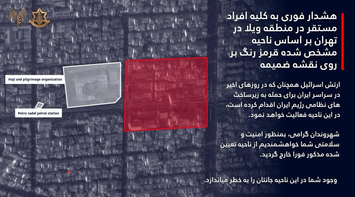 Isroil armiyasining fors tilidagi vakili Tehron va Qazvindagi ayrim hududlarni evakuatsiya qilish bo‘yicha ogohlantirish berdi. Tehrondagi nishonlar aholi zich joylashgan teatr va universitet yaqinida joylashgan.