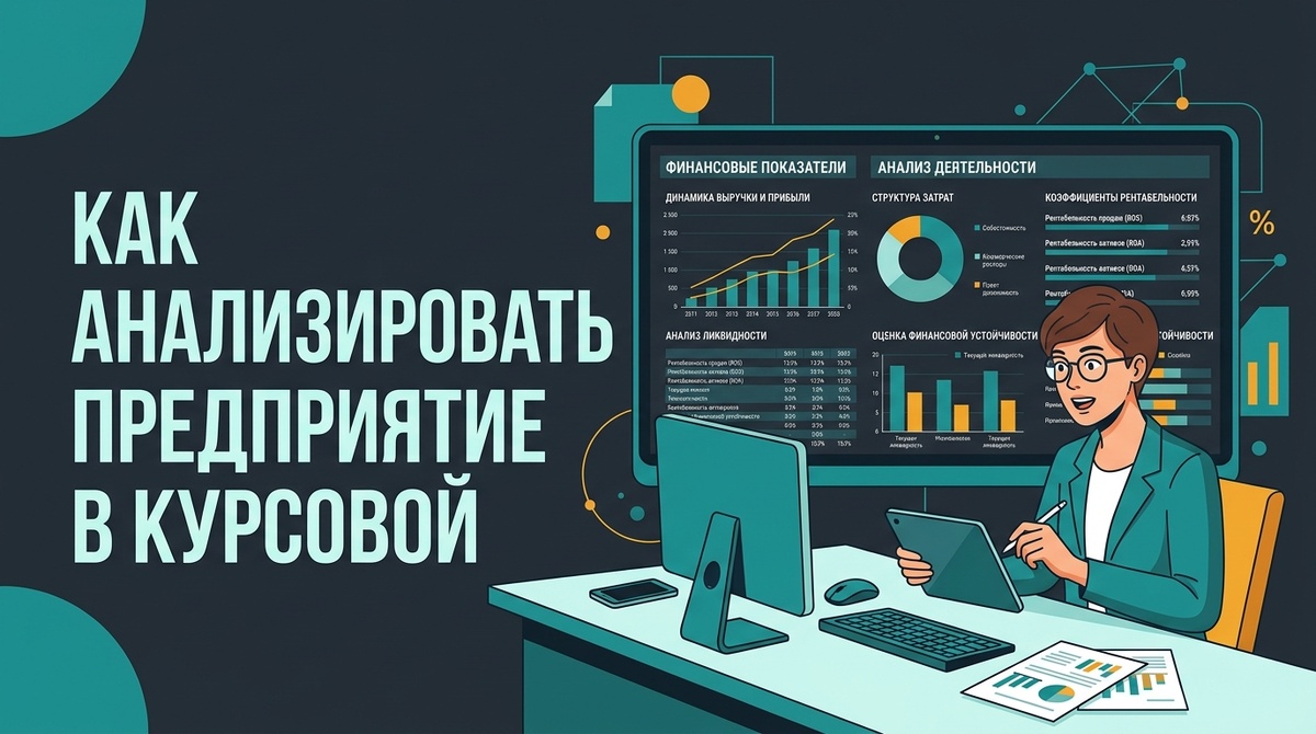 На третьем курсе мне дали тему «Финансовый анализ ПАО Ростелеком». Я думал — окей, крупная компания, данных куча, справлюсь. Открыл отчётность: 200 страниц цифр. Закрыл. Открыл Ютуб. Три недели пролетели. Потом была ночь накануне дедлайна и кофе литрами. Больше так не делай. Вот нормальная схема. Финансовый анализ предприятий — это не бюрократия ради бюрократии. По факту это инструмент, которым пользуются инвесторы, банки и сами менеджеры: понять, здорово ли предприятие финансово, не обанкротится ли оно через год и стоит ли вкладывать в него деньги. В курсовой работе ты делаешь то же самое — только в учебных целях. Берёшь реальную компанию, смотришь на её отчётность за несколько лет и отвечаешь: что происходит с деньгами? Есть ли проблемы? Что можно улучшить? Это звучит логично. Но большинство студентов превращают это в пустое перечисление цифр без смысла. Совет, который мне никто не давал вовремя: не берите огромные холдинги. Газпром, Сбербанк — это красиво на титульнике, но там так