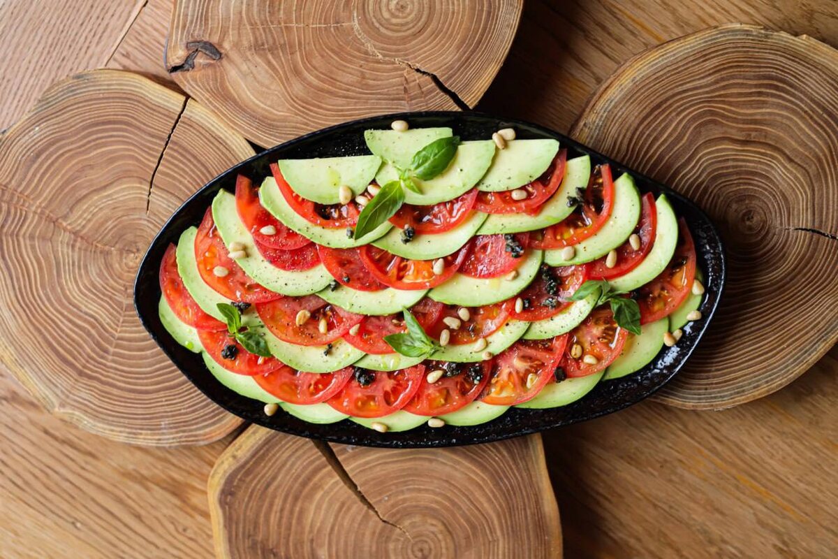 Любое карпаччо – это всегда сырые и тонко нарезанные продукты. Именно такая подача позволяет насладиться нюансами вкуса. Томаты передают блюду сочность, свежесть и ту самую кислинку. Спелые ломтики авокадо оттеняют вкус своей кремовой текстурой. А заправка с орешками и травами создает ансамбль вкуса. На что обратить внимание: Карпаччо – отличный стартер для легкого и полезного ужина, напоминающий о скором лете. При этом богатый витаминами и олеиновой кислотой Омега-9 авокадо обеспечивает долгое чувство насыщения.