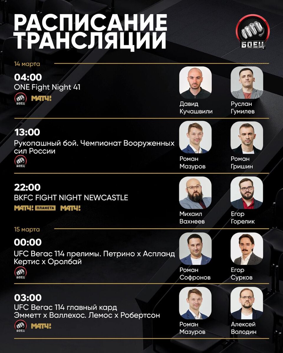 📺 В субботу ONE проведет большой турнир в Бангкоке. Лови в эфире ранним утром в субботу. Ссылка 👈 После этого переключимся на армейский рукопашный бой. Ссылка 👈 BKFC раздаст огня на радость любителям кулачки. Кстати, в удобное время. Ссылка 👈 А в ночь с субботы на воскресенье перенесемся в Вегас на турнир UFC. Ссылка 👈 План такой. Сохраняй к себе, чтобы ничего не пропустить.