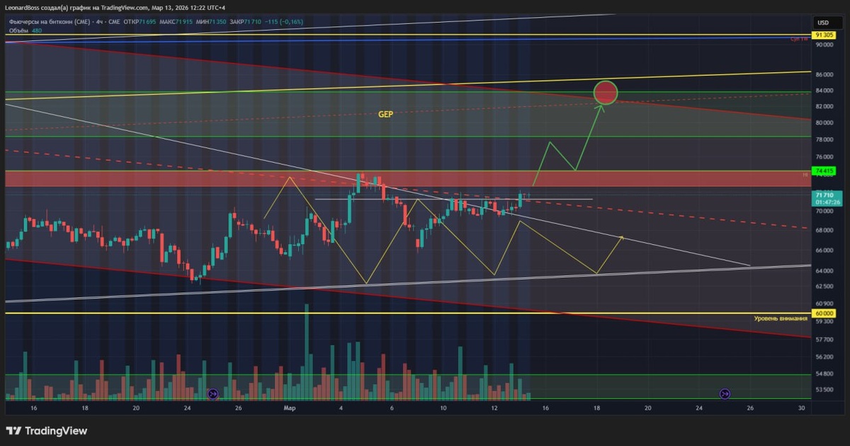 #BTC 🕯Локально🕯 ⚠️В дополнение к утренним мыслям. График BTC по CME, где мы смотрим и я уверен помним о существовании GEPа сверху. Наблюдаем повторную попытку пробоя среднесрочной трендовой. после неудачного выхода неделю назад. Над головой мощный блок сопротивления с верхней границей уровня 74К от которого и получили откат с ложным пробоем! ‼️Что нам необходимо увидеть для реализации окончательного импульса роста?? Да, как и говорил утром = пробой уровня 74К, который сейчас является основным препятствием на пути к закрытию GEPа. Также четко видно, что продолжение роста является логичным после пробоя сопротивления, поскольку сверху в зоне верхней границы GEPа есть глобальная трендовая + верхняя граница нисходящего канала = скопление притяжений для цены с открытым пространством, ранее мы уже неоднократно видели отработку аналогичных паттернов и триггеров! P.s. сегодня пятница, завершение рабочей недели и основных движений BTC, а значит есть большая вероятность получить очередное с