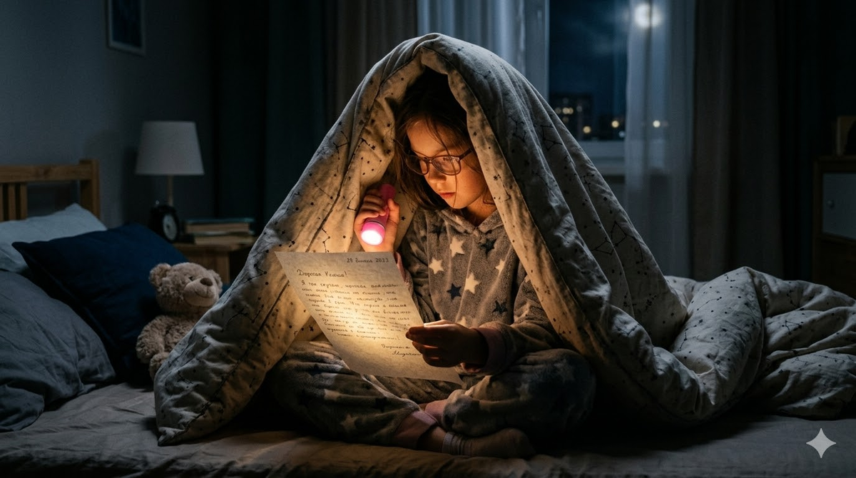 Маленькая рука нырнула под подушку, нащупав заветные сокровища: тусклый китайский фонарик и огрызок простого карандаша. Аня накрылась с головой, создав свой крошечный, тайный шатер света. Она достала смятый тетрадный лист в клетку и, высунув от усердия кончик языка, принялась писать. Буквы ложились неровно, но в каждой из них билось огромное детское сердце.