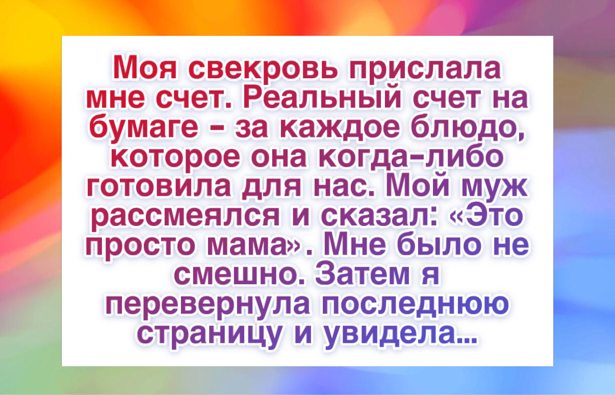 “Однажды свекровь прислала мне счет. Настоящий счет на бумаге. Там были перечислены все ужины, которые она когда-либо готовила для нас. Общая сумма была около 1 330 000 рублей. Муж рассмеялся и сказал, что это просто мама так шутит. А я сидела на кухне и злилась.