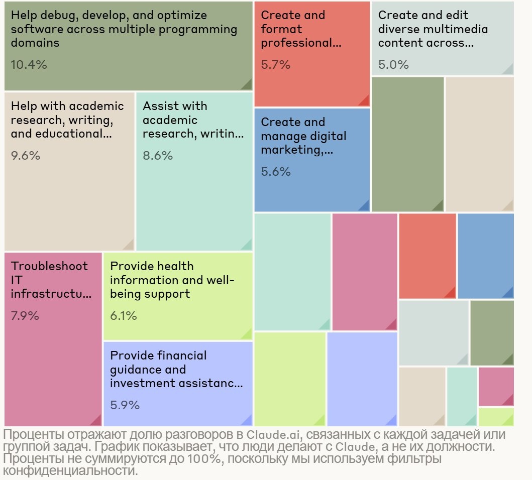 Новая структура будет изучать, как ИИ меняет общество: экономику, работу, правовые системы, распределение власти в мире. Возглавил институт Джек Кларк, сооснователь компании. В команде экономисты, инженеры, социологи. Серьезные люди с серьезными вопросами. Интересный подход внутри. Три направления работают вместе: 🔵команда красных, которая тестирует пределы возможностей моделей; 🔵исследователи, которые смотрят на реальное использование ИИ в мире; 🔵и экономисты, которые отслеживают влияние на рынок труда. ❗️Как раз про экономику. В январе институт выпустил большой отчет Anthropic Economic Index. Там данные за ноябрь 2025, живые цифры о том, как люди реально используют Claude. Выяснилось, что Claude чаще помогает, чем делает за человека: больше половины разговоров это совместная работа, обучение, итерации. Автоматизация пока больше в корпоративных API, там всё запрограммировано. Интересный момент про задачи. Чем сложнее задача и чем дольше её решал бы человек, тем ниже успех у мод