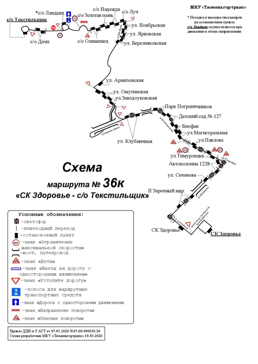 С 28 марта 2026 года изменится схема движения маршрута регулярных перевозок № 36к «Центральный рынок – с/о “Текстильщик”». Из схемы движения исключаются улицы Ленина, Мориса Тореза, Орджоникидзе, Республики, Профсоюзная, Алебашевская, Муравленко, Семена Шахлина в прямом и обратном направлениях. Из схемы движения исключаются остановочные пункты «ул. Володарского», «Детская поликлиника», «ул. Даудельная», «ул. Циолковского», «Алебашевский базар», «ул. Муравленко», «Городская поликлиника № 1», «ул. Семена Шахлина», «ДК “Орфей”», «ул. Любимая», «с/о “Березняки”» в прямом и обратном направлениях, «Центральный рынок 2», «ул. Эрвье», «ул. Газовиков» в прямом направлении, «Филиал библиотеки им. А.С. Пушкина», «Озеро Алебашево», «Сквер Немцова» в обратном направлении. В схему движения включается остановочный пункт «СК “Здоровье”» в прямом направлении. Маршруту № 36к будет присвоено новое наименование «СК “Здоровье” – с/о “Текстильщик”».