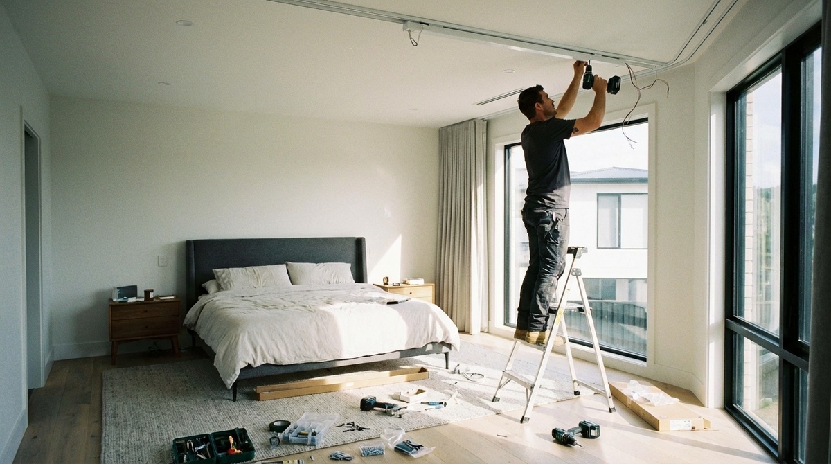 Присоедините двигатель к карнизу и проверьте работу прямо на полу. Шторы пока не вешаем — просто убе
