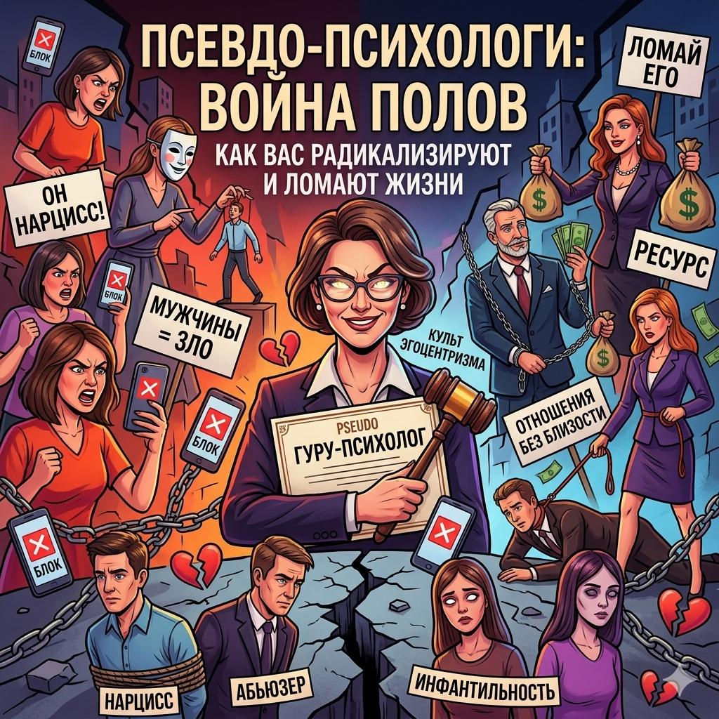 - Итог: Это не терапия, а проекция собственных непроработанных травм на аудиторию. Происходит маргинализация мужчин как класса. Женщины, наслушавшись таких советов, превращаются в «психологизированных воинственных инфантилок», которые за любым проявлением живой человеческой сложности видят угрозу и абьюз.
