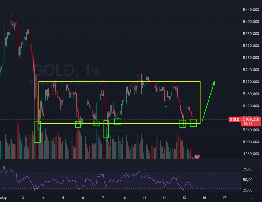 🥇 Золото 🟢Давно не писал про золото. Прошлый прогноз с выходом вверх из треугольника исполнился. Теперь у нас тут новый сетап. 🟢С 3 марта по настоящий момент мы встали в боковик. В этом боковике у нас изменилась логика покупателей: если раньше при неопределенностях и геополитике золото шло в рост - инвесторы бежали в него как в защитный актив, то после последнего сброса ликвидности в конце января, здесь поведение такое же как в индексе - есть страхи - падаем, нет страхов - рост. Тем не менее, текущий военный конфликт золото проводит в боковике - актив достаточно устойчив. В данном боковике мы находимся сейчас на его нижней границы. Ожидаю, что боковик продолжится, поэтому теперь ожидаю возврат цены к верхней границе боковике - на 5200. 🚗 Пока что ожидаю, что произойдет отбой от текущего уровня в сторону 5200. #золото #gold #gd1 #bogdanoffinvest $GDH6 $GDM6 $GDU6