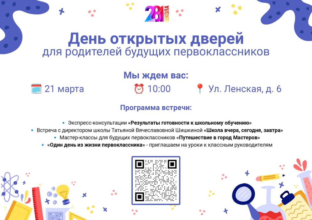 📣 📣 Уважаемые родители будущих первоклассников! Приглашаем вас на День открытых дверей! 📣 На Дне открытых дверей вы узнаете о современных тенденциях в образовании, познакомитесь со школой и учителями и проживете «Один день из жизни первоклассника». Программа встречи: 🔹 Экспресс-консультации «Результаты готовности к школьному обучению». 🔹 Встреча с директором школы Татьяной Вячеславовной Шишкиной «Школа вчера, сегодня, завтра». 🔹 Мастер-классы для будущих первоклассников «Путешествие в город Мастеров». 🔹 «Один день из жизни первоклассника» - приглашаем на уроки к классным руководителям. Мы ждем вас: 🗓 21 марта ⏰ 10:00 📍 Ул. Ленская, д. 6 ❗️ Необходима предварительная регистрация До встречи! 📣 Школа № 281 в MAX #ДОНМ #ШколыКолледжиМосквы