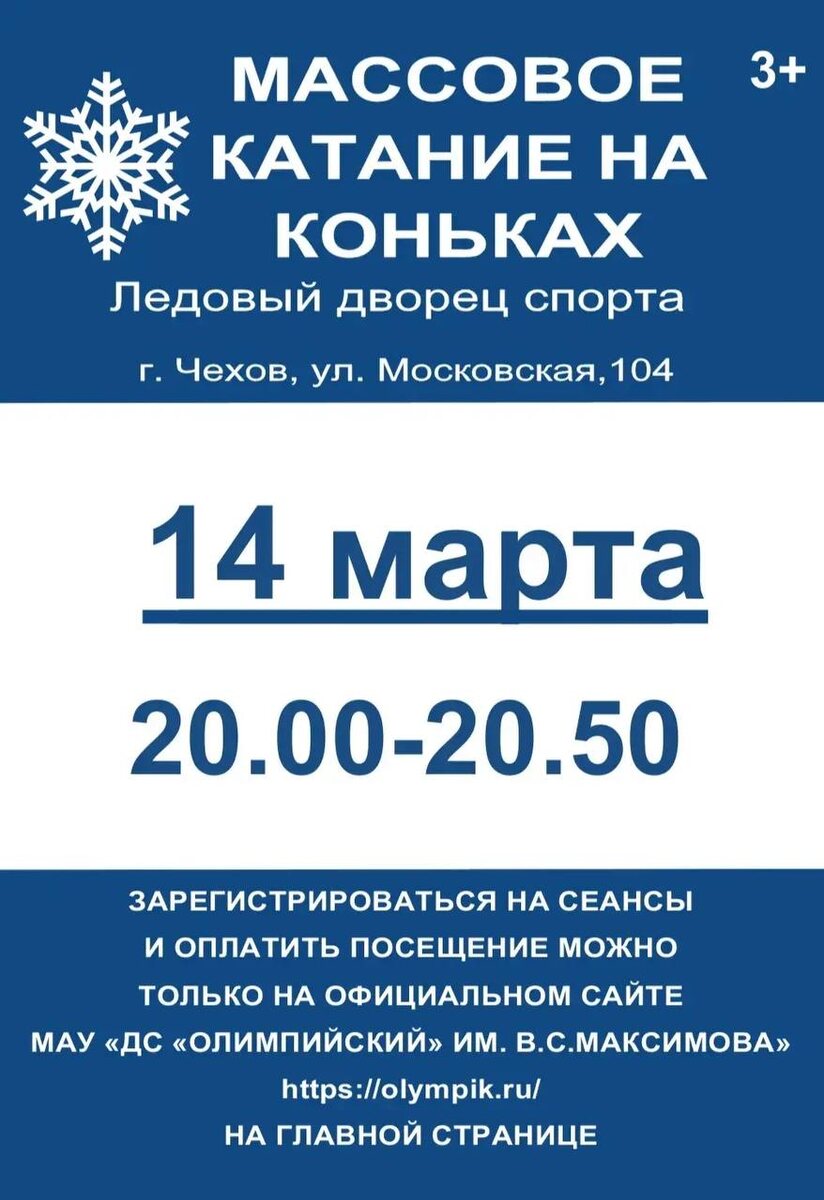 ✨ Массовое катание на льду на коньках в Ледовом дворце Сеанс 20:00 - 20:50 🎵 К вашим услугам качественный лед, хорошая музыка, прокат и заточка коньков. ℹ️ Размеры коньков: с 27 по 46. 💵 Стоимость проката: детские 200 руб., взрослые 300 руб. 📆 14.03.2026 🕛 20:00 🏢 Ледовый дворец спорта «Витязь» 📍 г. Чехов, ул. Московская, д.104 🔗 Купить билет: https://clck.ru/3NsBk2 ⭐Поддержать канал голосом ✅ Мероприятия Чехов https://dzen.ru/id/66cc4b48e9ef144699238a51 https://vk.ru/chekhov_events http://dzen.ru/chekhov_events