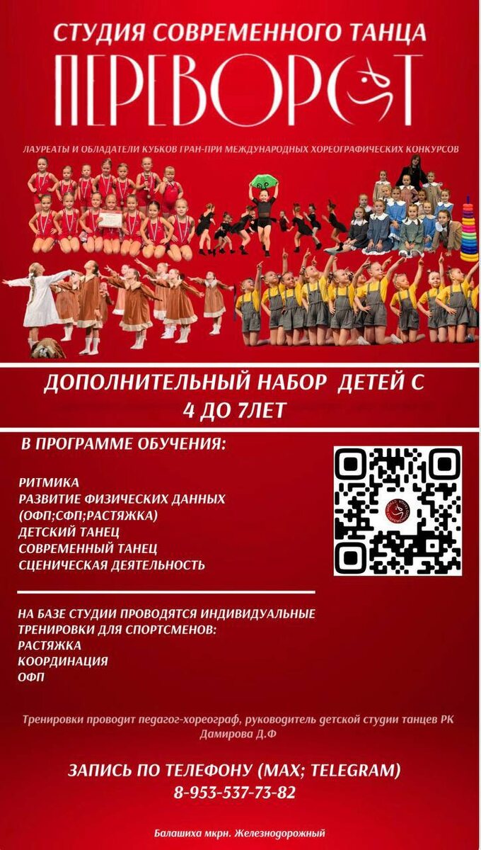 💃Студия современного танца «Переворот» НАБОР ДЕТЕЙ НА СЕЗОН 2026-2027 💃 Принимаются дети с 4-х до 8 лет ✅ Профессиональное развитие координации и гибкости ✅ Формирование дисциплины, уверенности и любви к искусству ✅ Обучение по выстроенной программе, ориентированной на результат 🏅При студии проводятся индивидуальные тренировки для спортсменов разного профиля: гимнастов, фигуристов, хоккеистов. 🤳УСПЕЙ ЗАПИСАТЬСЯ НА ПРОБНОЕ ЗАНЯТИЕ. Адрес: Мкр. Железнодорожный, ул. Андрея Белого, д.1 Руководитель/ хореограф 89535377382 Дамирова Диана Фаиговна ( telegram/Max) Наша группа ВК https://vk.ru/perevorotdance