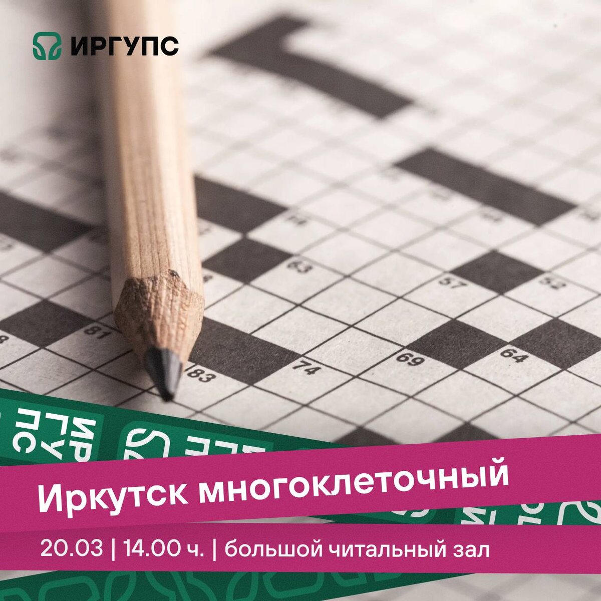 ИрГУПС присоединяется к акции газеты «Иркутск» – пятому чемпионату по решению кроссвордов «Иркутск многоклеточный». В этом году состязание посвящено 365-летию со дня образования Иркутска. Приглашаем всех желающих испытать свои силы в заполнении клеточек правильными ответами на непростые вопросы об истории и культуре нашего города 20 марта в 14.00 ч. в большой читальный зал библиотеки. На решение кроссворда даётся час. Участники с наибольшим количеством правильных ответов проходят в финальный этап чемпионата. Победители конкурса получат дипломы и памятные призы. 🤝 Больше новостей и анонсов – ИрГУПС в MAX