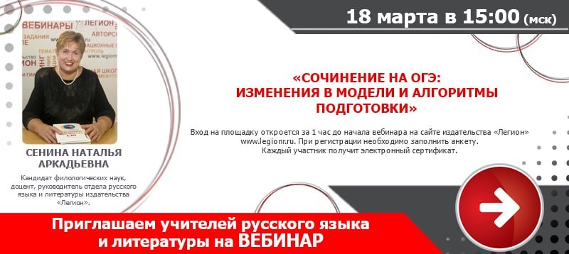 » Дата: 18.03.2026 г. Время: 15:00 Лектор Сенина Наталья Аркадьевна - кандидат филологических наук, доцент, руководитель отдела русского языка и литературы издательства «Легион». Участие бесплатное. Выдается сертификат. Требуется регистрация на сайте издательства
