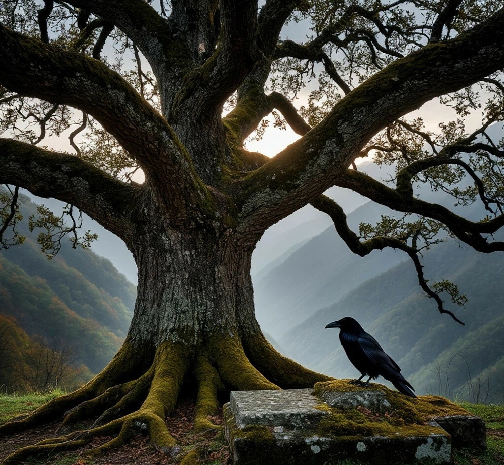 В этот момент на ветку дуба, прямо над нами, приземлился огромный чёрный ворон. Он громко каркнул, и от этого звука у меня мороз пробежал по коже.