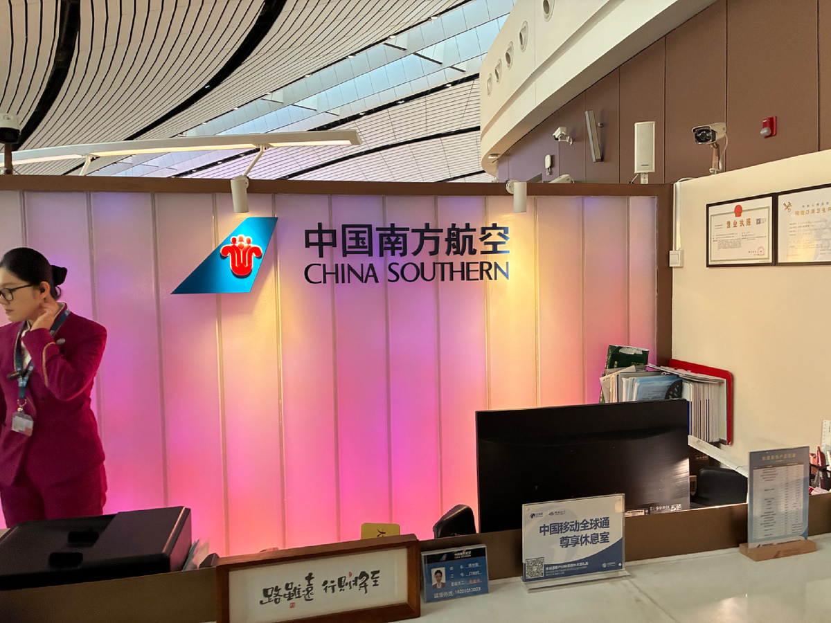 Я уже описывал бизнес-зал в аэропорту Дасин Пекина от авиакомпании China Eastern Airlines: но в этот раз в Японию решили полететь другой китайской авиакомпанией : China Southern Airlines. Основные аэропорты этой авиакомпании расположены на юге Китая(как можно судить по названи) - Гуаньчжоу и Шэньджэнь, но есть стыковочные рейсы и через Пекин, на который мы и брали билеты в январе. По общему впечатлению Южные авиалинии немного лучше, чем Восточные, посмотрим, как выглядит бизнес-зал от этой авиакомпании. Расположен он на том же ярусе, что и бизнес -зал Восточных авиалинии, только в противоположной стороне. Если вы поднимаетесь на этот ярус после прохождения трансфер-контроля по прилету из Москвы, то бизнес -зал Южный авиалиний будет слева. Стенд при входе. Тогда он был посвящен новогодней тематике: Пассажиров в бизнес-зале не так много, как у Восточных авиалиний. Сразу видно, что Пекин для Южный авиалиний не основной хаб. И здесь абсолютно нет того дикого столпотворения китайцев, котор