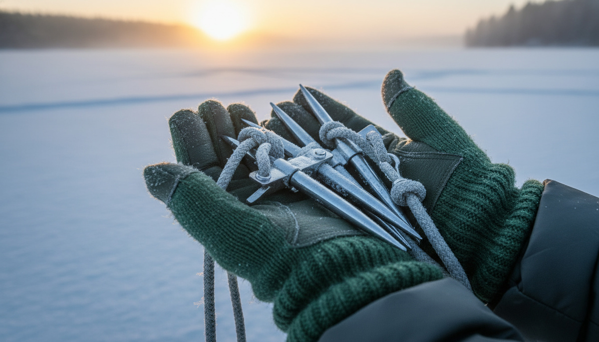 - Ледовые шипы (две ручки с шипами на шнурке) — чтобы зацепиться за кромку и вытащить себя, когда руки уже в воде и пальцы не слушаются.