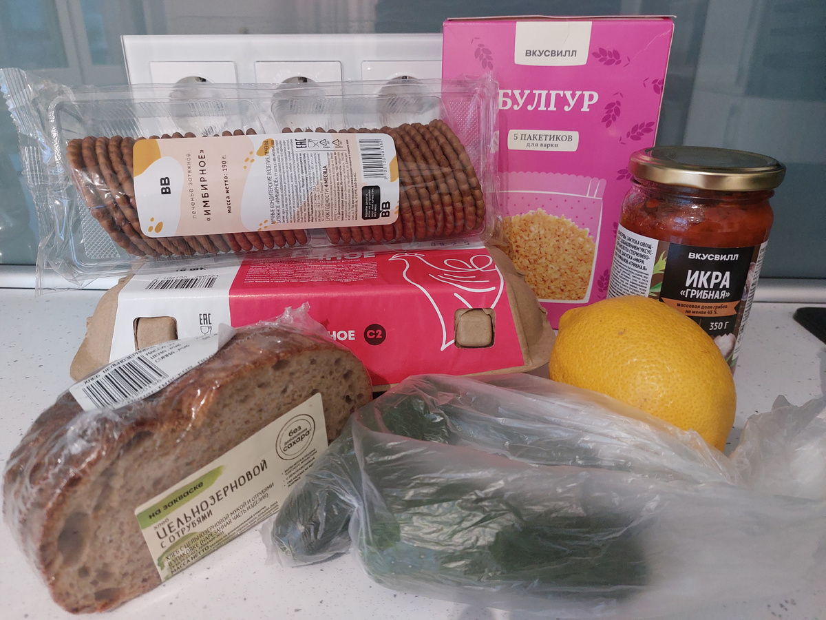 Просто купила продукты: яйца, колбасу, булгур, огурцы, грибную икру. И этих продуктов мне хватило на несколько завтраков.