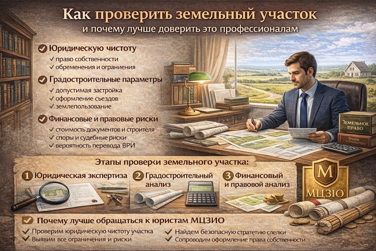 Обратившись к юристам МЦЗИО, вы получите комплексную проверку, экспертную оценку и надёжное сопровождение сделки, что позволит безопасно использовать участок и реализовать свои планы.Покупка или оформление земельного участка — ответственное решение. Незнание юридических и градостроительных особенностей участка может привести к финансовым потерям, отказу в согласовании строительства или к проблемам с соседями и органами власти.