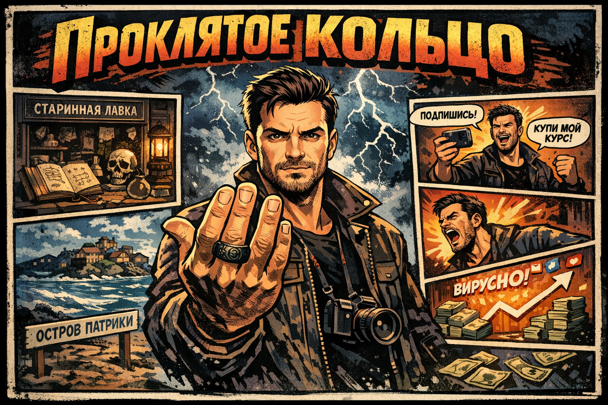 Френк ехал на остров Патрики как на очередное приключение: сменить город, найти материал для контента, может быть, встретить кого-то, кто купит его следующий курс. Остров встретил его ветром и запахом соли, узкими улочками и старым рынком, где он нашёл странную лавку с вещами, которые казались слишком старыми, чтобы быть просто антиквариатом. Среди пыли и пожелтевших бумаг лежало кольцо — тёмный металл с едва заметной гравировкой. Он надел его на палец ради шутки, и мир вокруг изменился.