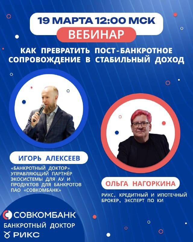 Поговорим об этом 📅 19 марта (четверг) | 12:00 МСК 📍 Онлайн. Ссылка появится в нашем канале за час до начала. Спикеры: 👤Игорь Александрович Алексеев — «Банкротный доктор», управляющий партнёр экосистемы для АУ и продуктов для банкротов ПАО «Совкомбанк». 👤Ольга Васильевна Нагоркина — РИКС, кредитный и ипотечный брокер, эксперт по КИ. Обсудим реальные инструменты восстановления кредитного рейтинга - двухэтапную модель реабилитации: очистка КИ (РИКС + ФССП) и прохождение программы "Банкротный доктор". Дайте клиенту результат «под ключ» и станьте экспертом №1 в своей нише! 📌 Присоединяйтесь, будет интересно! 🗒 Вопросы можно направить заранее, заполнив форму.: https://forms.yandex.ru/u/698883c249af47a42a113af3