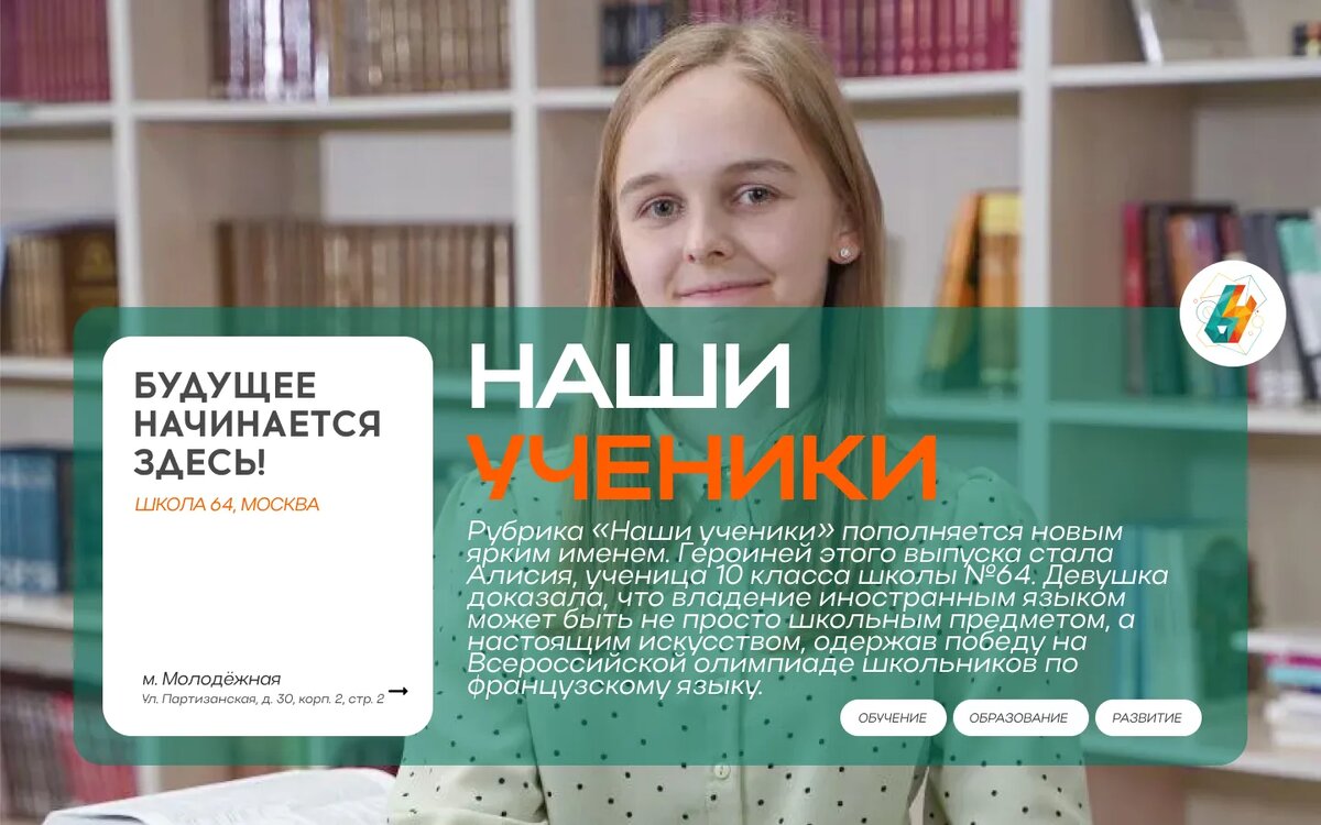 Рубрика «Наши ученики» пополняется новым ярким именем. Героиней этого выпуска стала Алисия, ученица 10 класса школы №64. Девушка доказала, что владение иностранным языком может быть не просто школьным предметом, а настоящим искусством, одержав победу на Всероссийской олимпиаде школьников по французскому языку. Почему ты выбрала французский язык? Большую часть жизни я провела во франкоговорящих странах, поэтому французский был мне необходим для повседневной жизни. Но по возвращении в Россию я решила не забрасывать его, ведь этот язык мне действительно по душе и вызывает у меня тёплые чувства. Давно ли ты его изучаешь? Я изучаю французский с 6 лет, но даже сейчас, спустя 10 лет, не перестаю узнавать новые слова и выражения. И это очень интересно. Как проходила твоя подготовка к олимпиаде? По результатам муниципального этапа меня приняли в сборную Москвы по французскому языку, которая предлагает 6 часов занятий с подготовкой к олимпиадным заданиям в неделю. Также перед каждым этапом прох