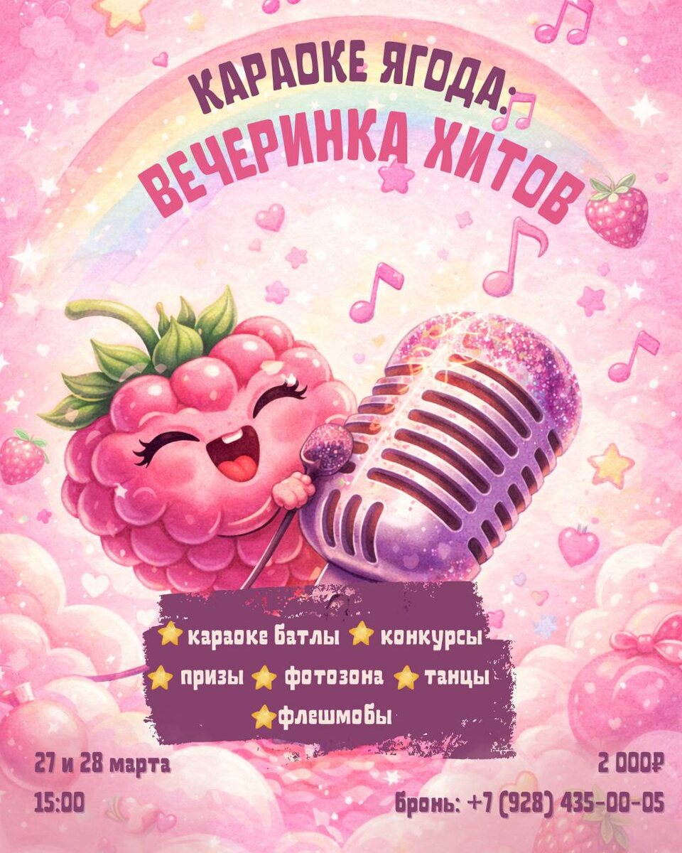 ! Самая яркая детская караоке-вечеринка в Загородном клубе «Ягода Малина»! ✨ Пой, танцуй, участвуй в конкурсах и почувствуй себя настоящей звездой сцены! В программе: 🌟 Караоке-баттлы на популярные хиты 🌟 Танцевальные флешмобы 🌟 Конкурсы «Угадай хит» и «Звёздный дуэт» 🌟 Призы и подарки каждому участнику 🌟 Яркая фото-зона 📅 27 и 28 марта 🕒 15:00 Билет: 2000₽ 👧👦 Возраст: 7–14 лет 📲 Бронь: +7 (928) 435-00-05 Количество мест ограничено — успейте записаться! 🍓