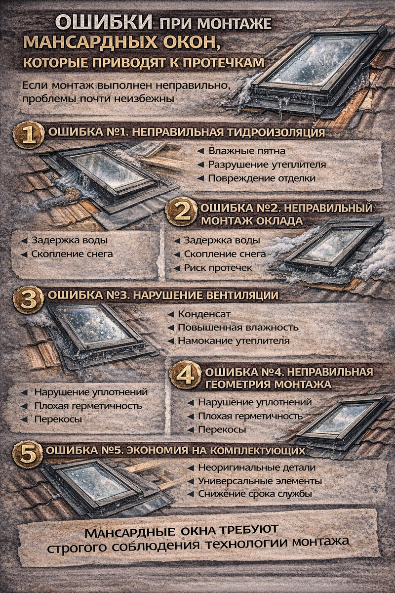 мансардное окно — это один из самых сложных узлов кровли. И если монтаж выполнен неправильно, проблемы почти неизбежны. Разберём основные ошибки, которые чаще всего приводят к протечкам. Вокруг окна должна быть правильно выполнена гидроизоляция. Она защищает конструкцию от: Если гидроизоляционный контур сделан неправильно, вода начинает попадать внутрь кровельного пирога. Сначала это почти незаметно, но со временем появляются: Оклад — это специальная система элементов, которая соединяет окно с кровельным покрытием. Его задача — отводить воду. Если оклад установлен с нарушением технологии: Поэтому важно использовать оригинальные системы монтажа производителя. Мансардное окно находится внутри кровельной конструкции. Если вокруг него нарушается вентиляционный контур, возникает: Это может привести к повреждению всей конструкции вокруг окна. Окно должно быть установлено строго по уровню и в правильно