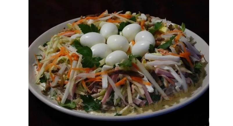 Салат «Ласточкино гнездо» - простой и быстрый в приготовлении салат, который подходит для праздничного стола. Существует несколько вариантов рецепта, например, с ветчиной и грибами или с курицей и яблоком.