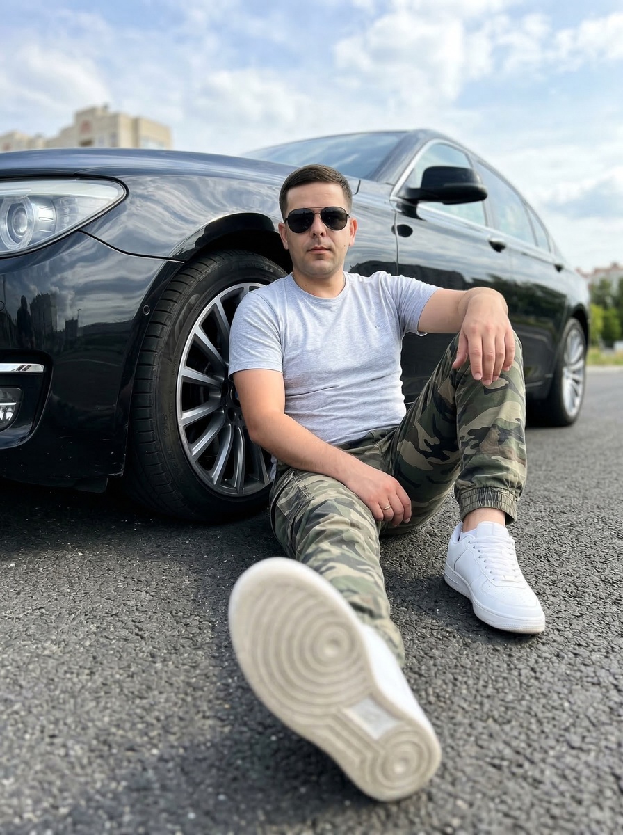 🤖Генерировать можно здесь: 👉БОТ ДЛЯ ГЕНЕРАЦИИ Режим Nano Banana 2/Pro ИНСТРУКЦИЯ Фотореалистичный снимок уверенного в себе молодого мужчины с загруженного фото, точное сходство обязательно. Он сидит на асфальте, прислонившись к переднему колесу роскошного черного седана BMW. Мужчина смотрит прямо в камеру с дерзким, спокойным выражением лица через темные солнцезащитные очки. На нем стильная повседневная одежда: светло-серая рубашка с короткими рукавами, модные камуфляжные штаны карго и белые кроссовки. Одна нога вытянута вперед, создавая динамичную перспективу, при этом подошва его кроссовка находится на переднем плане и слегка размыта. Съемка ведется с очень низкого ракурса, что придает композиции монументальность и акцентирует внимание на фигуре и автомобиле. Яркий дневной свет создает четкие тени и блики на глянцевой поверхности машины. Малая глубина резкости размывает фон с голубым небом и легкими облаками, фокусируя все внимание на главном объекте. Высокая детализация, профессио