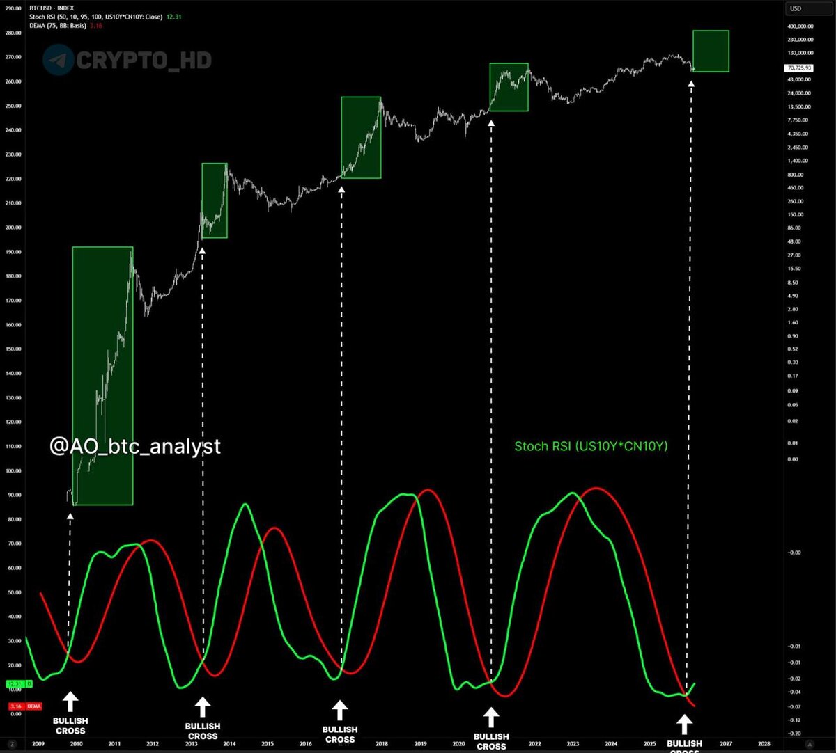 🤔 Потенциальный рост Биткоина до $400,000 к 2027 году – паттерн на основе доходностей гос. облигаций США и Китая (US10Y × CN10Y).