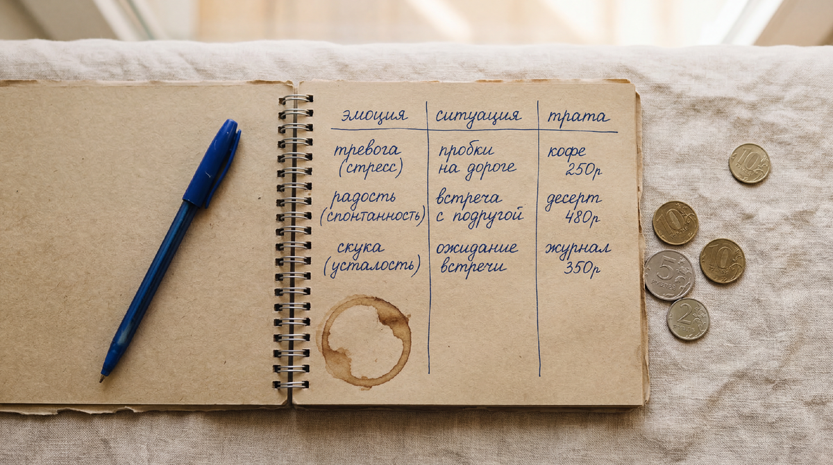 Однажды я открыл выписку с карты и завис минут на пять. Не потому что там было пусто. А потому что я смотрел на список трат и честно не мог вспомнить половину из них. Кофе. Ещё кофе. Какая-то ерунда на маркетплейсе. Роллы в 23:00. Подписка на что-то, название которого я даже не узнал. Я сидел и думал: я же не транжира. Я слежу за деньгами. Откуда это всё? Вот тогда я первый раз подумал что проблема не в деньгах. Проблема где-то внутри. Есть такая штука которую никто не говорит вслух. Большинство импульсивных покупок это не про желание что-то иметь. Это про желание что-то не чувствовать. Тревогу. Скуку. Усталость. Злость после разговора с кем-то. Ощущение что день прошёл впустую и надо хоть чем-то себя порадовать. Ты не покупаешь футболку. Ты покупаешь пять минут когда мозг переключился и полегчало. Я не сразу это понял. Мне понадобилась неделя дневника чтобы увидеть это у себя. Идея дневника эмоций простая до смешного. После каждой траты записываешь три вещи. Что купил. Что чувствовал