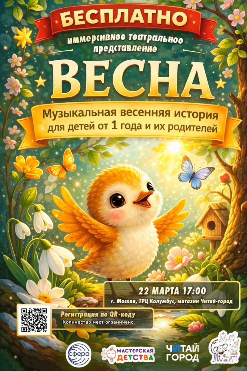 ! «Мастерская детства» совместно с театром «МалышАТР» и сетью книжных магазинов «Читай-Город» приглашают детей и родителей на новый иммерсивный спектакль. Погрузитесь в волшебный мир природы и музыки! Малыши узнают: 🌼как пробуждается лес и его жители после долгой зимы с помощью чарующих звуков флейты 🌼послушают пение соловьев, звон капель и шум весенних ручейков 🌼насладятся красотой первых распускающихся цветов и листочков Спектакль рассчитан для самых маленьких зрителей — от 1 года и старше. Продолжительность — 45 минут. 💜 Где: г. Москва, ТРЦ «Колумбус», Москва, Кировоградская ул., 13А 💜 Когда: 22 марта, 17:00 💜 Для кого: дети от 1 года (и их родители) 💜💜💜 Количество мест ограничено. Чтобы участвовать, необходим «золотой билет», который придет на почту после регистрации. Его наличие — гарантия личного участия ребенка и получение бесплатного подарка. Советуем не откладывать регистрацию — сделайте это прямо сейчас! 💜💜💜💜💜 💜 Регистрация 💜 Ждем вас на волшебной весенн