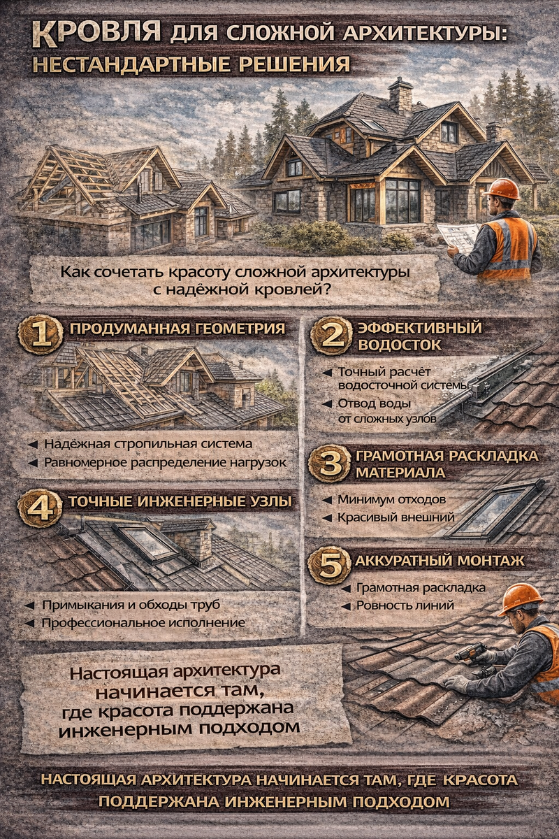 Но за красивой архитектурой стоит серьёзная инженерная задача. Потому что чем сложнее форма кровли — тем выше требования к проектированию и монтажу. У простой кровли есть минимум узлов и понятная геометрия. Сложная архитектура добавляет: Каждый дополнительный элемент — это новый технический узел. В сложной кровле особенно важно правильно построить стропильную систему. Она должна обеспечить: Если геометрия нарушена даже немного, это сразу становится заметно. Кровля может выглядеть неровной, а нагрузка на элементы распределяется неправильно. В сложных кровлях вода может собираться в разных точках. Поэтому важно заранее продумать: Ошибки в этих местах чаще всего приводят к протечкам. При сложной архитектуре особенно важна грамотная раскладка кровельного материала. Она влияет на: Неправильная раскладка может испортить даже дорогой материал. Не кажда