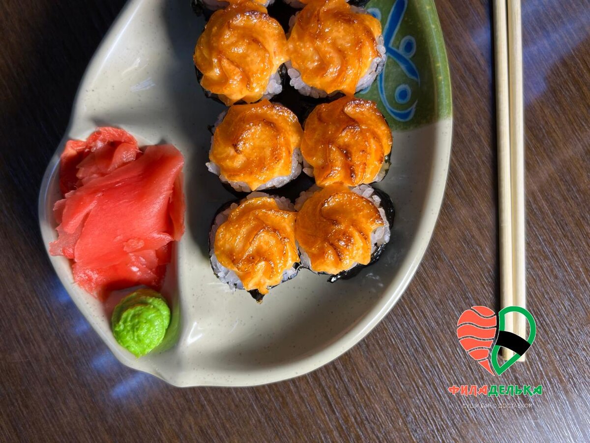 ! Красавец-ролл 😋 🔥 Что внутри? 🔥 Лосось как будто бы только что пойманный, свежий и нежно-розовый. Вокруг него нежнейший сливочный сыр, тающий во рту словно облако. А сверху… О нет, это не просто ролл! Это настоящее кулинарное шоу начинается здесь и сейчас! ✨ Майонезная шапочка – пышная, гладкая, сияющая золотистым блеском после запекания. На ней крошечными звёздочками рассыпана икра масага – каждая бусинка искрит солёностью и свежестью океана 🌊 ❤️ Почему мы любим этот ролл? ❤️ Он сочетает в себе сладость лосося, кремовую мягкость сыра и пикантную нотку запечённого майонеза с морской солью. Каждый кусочек дарит незабываемые ощущения, согревает душу и оставляет лёгкое послевкусие счастья 💖 Цена порции (4 шт.) всего лишь 260 рублей. Настоящая находка для тех, кто хочет попробовать нечто особенное за небольшие деньги! И помните: если вы вдруг увидите этот волшебный ролл у себя на тарелке – обязательно поделитесь впечатлениями с друзьями 😉