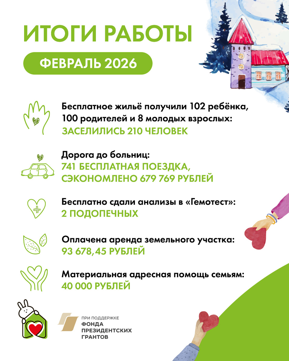 Коротко о самых важных событиях прошедшего месяца. В феврале в социальную гостиницу для онкобольных детей заселились 210 человек: - 102 ребёнка - 100 родителей - 8 молодых взрослых 🚕 Подопечные совершили 741 бесплатную поездку на такси до больниц и обратно на сумму 679 769 руб. Также было выполнено 3 доставки на сумму 3 132,97 руб. 🧪 Двое подопечных бесплатно сдали анализы в лаборатории «Гемотест». 📄 Закуплен годовой запас бумаги и картриджи для поста администраторов — 85 979,2 руб. Покупка произведена из средств гранта Фонда президентских грантов (https://xn--80afcdbalict6afooklqi5o.xn--p1ai/public/application/item?id=b6e76900-1e7a-429b-9ea8-4351eab8f932). 📌 Выполнена «задача месяца» — оплачена аренда земельного участка: 93 678,45 руб. 💛 Материальная адресная помощь семьям — 40 000 руб. 📺 15 февраля, в Международный день детей с онкозаболеваниями, телеканал НТВ выпустил сюжет о «Добром доме». Благодаря этому в фонд поступили пожертвования на сумму 3 429 175 руб. 🎀 В этот же ден
