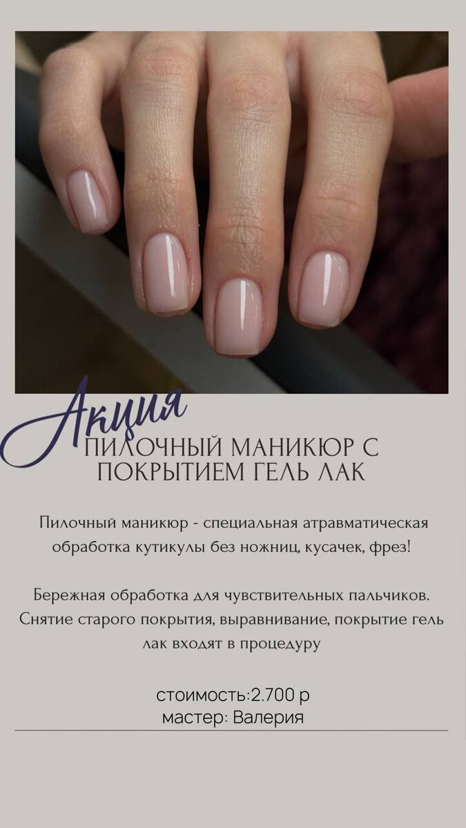 ! 🔥 Пилочный маникюр с покрытием гель лак "ТОЛЬКО ДО 25.03! Пилочный маникюр - специальная атравматическая обработка кутикулы без ножниц, кусачек, фрез! Бережная обработка для чувствительных пальчиков. Снятие старого покрытия, выравнивание, покрытие гель лак входят в процедуру 😍 Старший мастер ногтевого сервиса Валерия 2 700руб. запись доступна по ССЫЛКЕ! ♥️