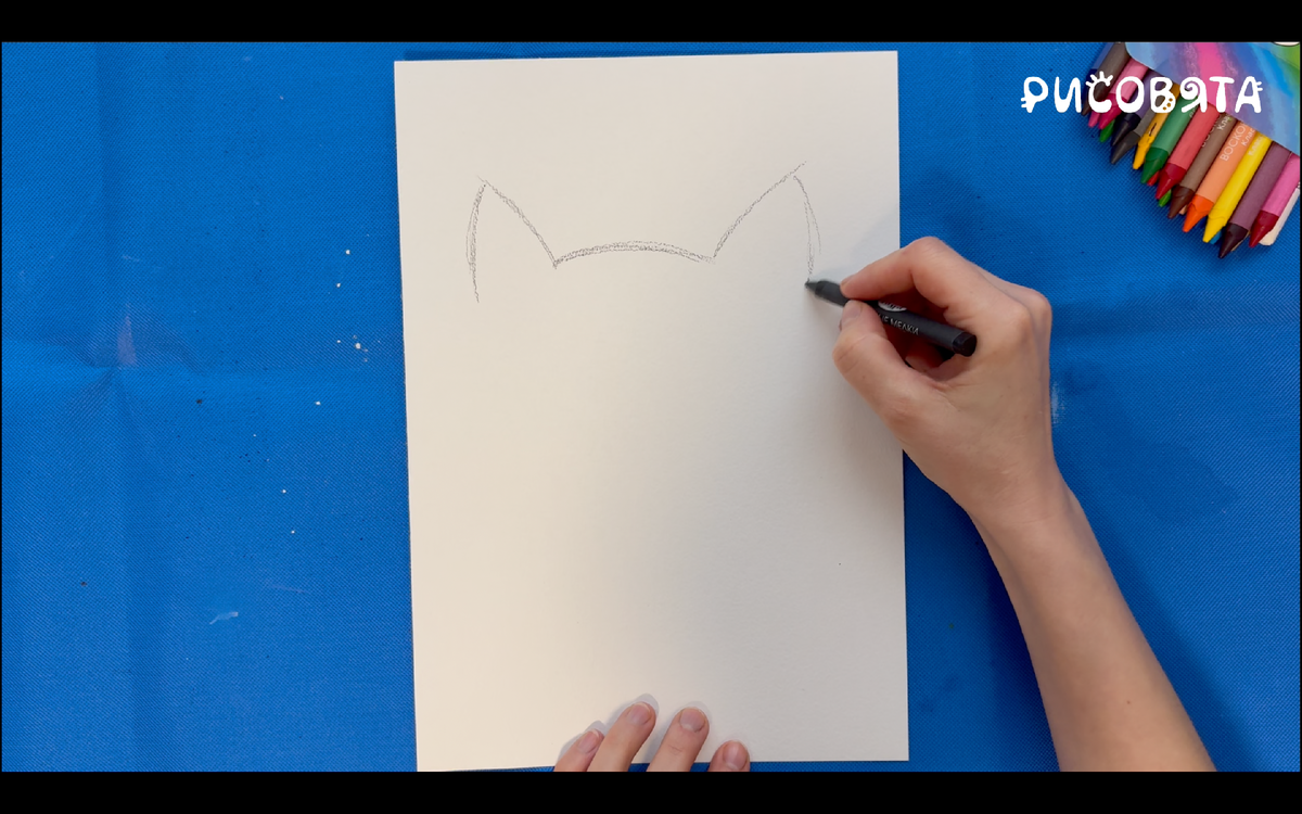 Сибирские котики - это большие и пушистые красавцы с густой шерсткой и добрыми глазами. Они похожи на маленьких лесных зверей, но при этом, очень любят своих хозяев и мурлыкать на диване. А давайте нарисуем такого сибирского котика вместе с ребенком! Меня зовут Наташа, и я создаю пошаговые уроки рисования для детей, а также уроки с аппликациями и поделками. Каждую неделю выходит новая тема, подпишитесь, чтобы не потерять и приступим к рисованию! Сегодня мы будем рисовать восковыми мелками. Это очень удобный материал для детей: мелки яркие, не пачкают руки, ими можно рисовать с разным нажимом, смешивать цвета прямо на бумаге. А главное - они отлично передают пушистость! Для рисунка нам понадобится: лист бумаги и восковые мелки. Начинаем рисовать! Сначала рисуем верхнюю часть головы котика с ушками. Я рисую черным мелком, ребенок может взять мелок того цвета, который ему нравится. Дорисовываем две линии вниз - туловище котика. Рисуем глазки - круги, а внутри еще по маленькому кругу. Нос