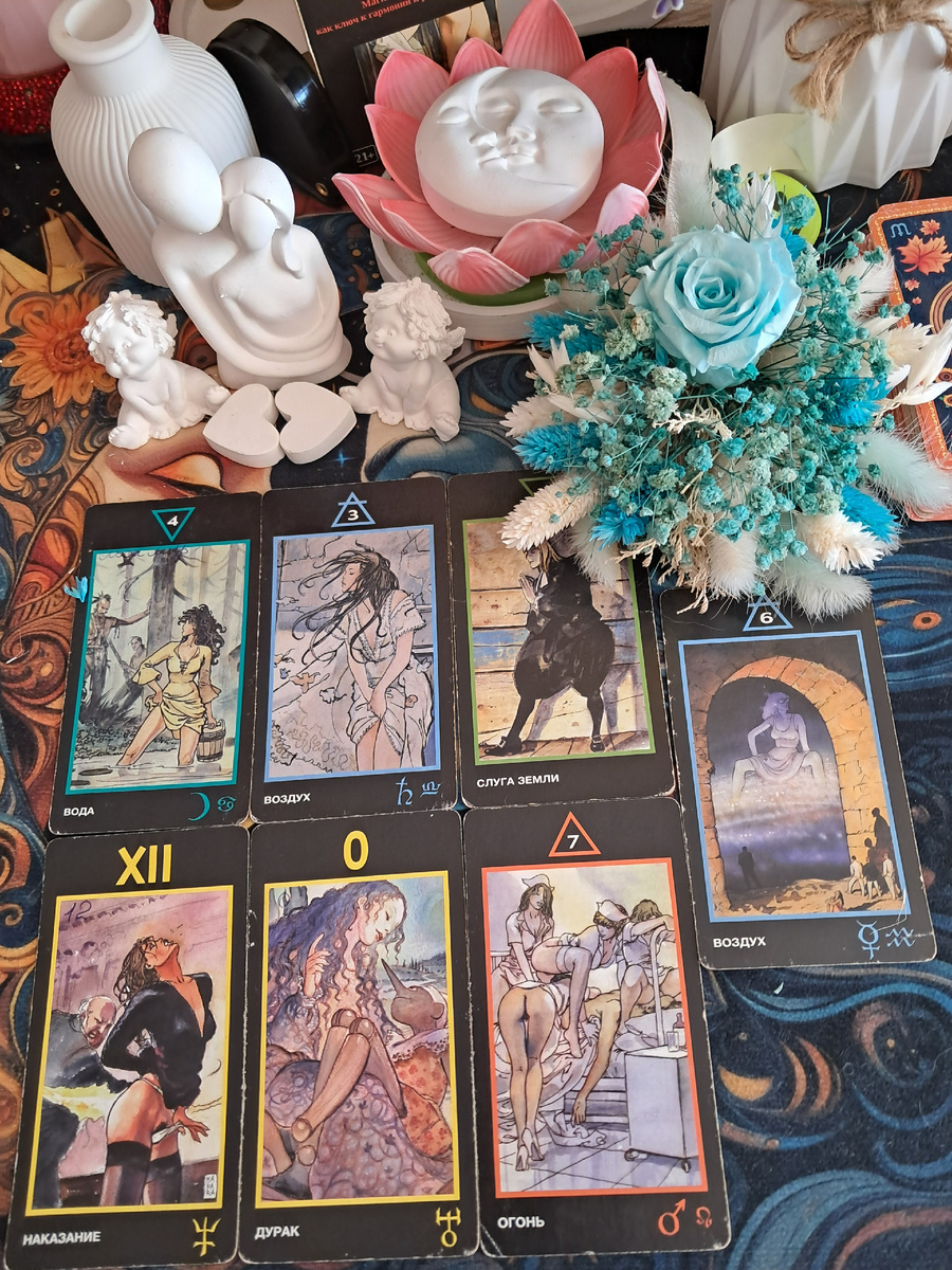 Этот расклад на колоде Манара (чувственной и эротической) открывает сложную и противоречивую картину того, что на самом деле происходит в душе вашего мужчины по отношению к вам. Давайте разберем каждую карту как часть его внутреннего состояния.