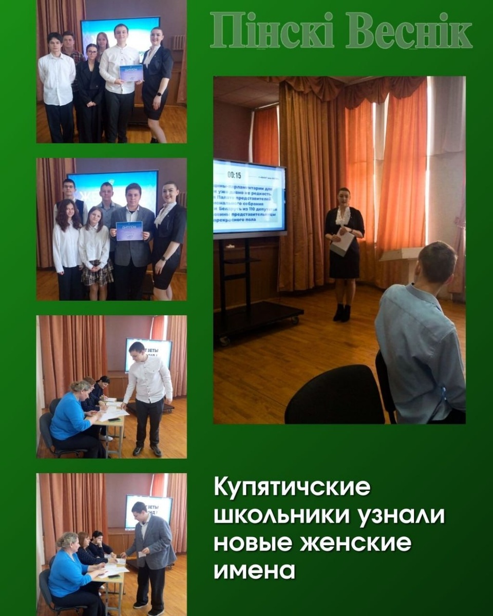 ✔️В рамках республиканского проекта ОО «БРСМ» «Пульс молодежи» в Купятичской средней школе прошла интеллектуальная игра «Женские имена на карте Беларуси». ✏️Ребята открыли для себя новые имена выдающихся соотечественниц, которые внесли неоценимый вклад в историю, науку, культуру, спорт, образование страны и продолжают вдохновлять своим примером современное поколение. 👆По итогам игры места распределились следующим образом: Первок место – заняла команда «СНК», второе – команда «МАЗ», третье – «Орлы». Поздравляем победителей! @Пинский Вестник 📱Ютуб 📱ВК 📱ИНСТАГРАМ 📱ОК 📱ФЕЙСБУК 📱ТИК ТОК Прислать новость