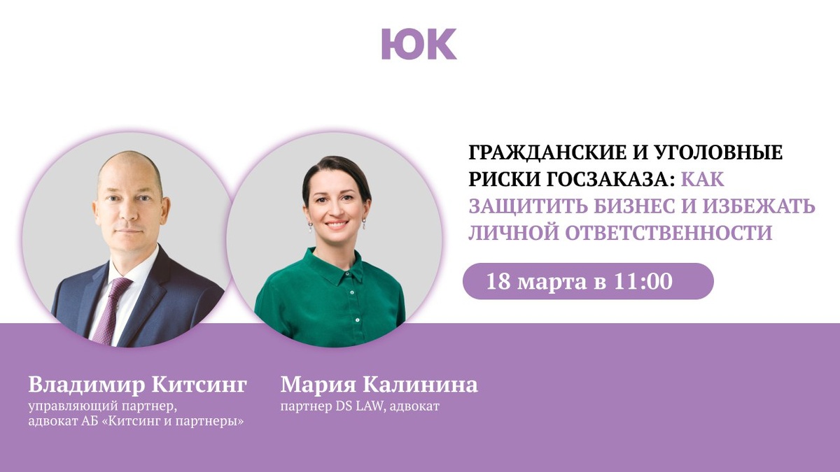 » 📅 Когда: 18 марта в 11:00 по мск. Участие бесплатное, регистрация здесь. 🎙 Спикеры: Владимир Китсинг , управляющий партнер, адвокат АБ «Китсинг и партнеры» и Мария Калинина, партнер DS LAW, адвокат На вебинаре обсудим тревожные тенденции 2026 года: на чем сейчас фокусируются заказчики и правоохранители. Узнаете, как формируется практика односторонней реституции по исполненным контрактам. Спикеры поделятся тем, какие ошибки могут привести к приговорам, а также планом действий на случай, если проверка уже началась. ↖️ Регистрируйтесь по ссылке, чтобы подключиться к прямому эфиру и после вебинара получить запись. 🟣 Подписаться на канал «Юрист компании» | 🇷🇺 Читать нас в MAX