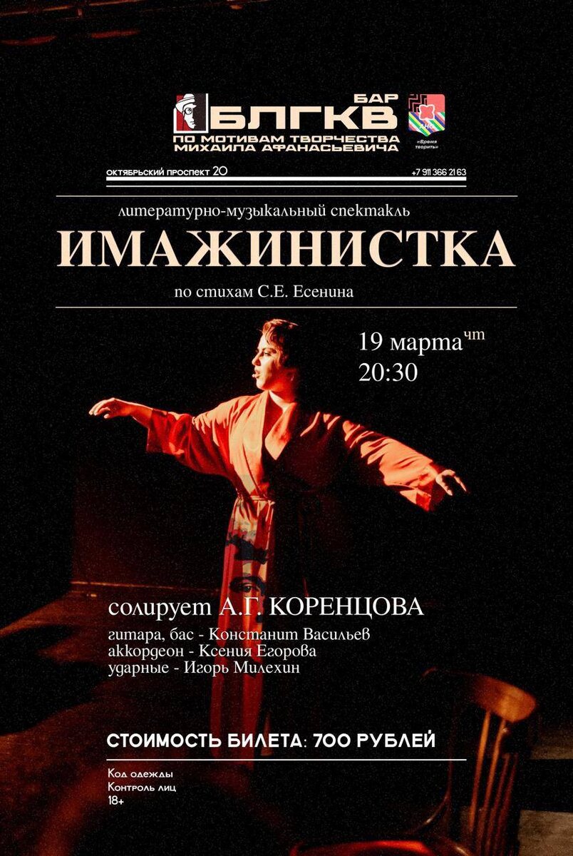 Литературно-музыкальный спектакль в БЛГКВ баре 🎭 🎙 «Имажинистка» — это метафорический мир, аллегория внутреннего пространства героини. В нём реальность переплетается с фантазией, свет с тенью, прошлое с настоящим. В центре — женщина, которая через страстное исполнение стихов и песен воплощает голос мужчины-поэта. Так она раскрывает внутренний мир Есенина: его чувства, противоречия и ранимую душу. 🎼 Живая музыка дополняет поэтическое слово и усиливает образ героини. Солистка — Анастасия Коренцова Гитара, бас — Константин Васильев Аккордеон — Ксения Егорова Ударные — Игорь Милехин 📆 19 марта в 20:30. 🎟 Билеты. 📍 Псков, Октябрьский, 20. Оставайтесь с нами #НашаПсковскаяобласть Присоединяйтесь к нам в МАХ!